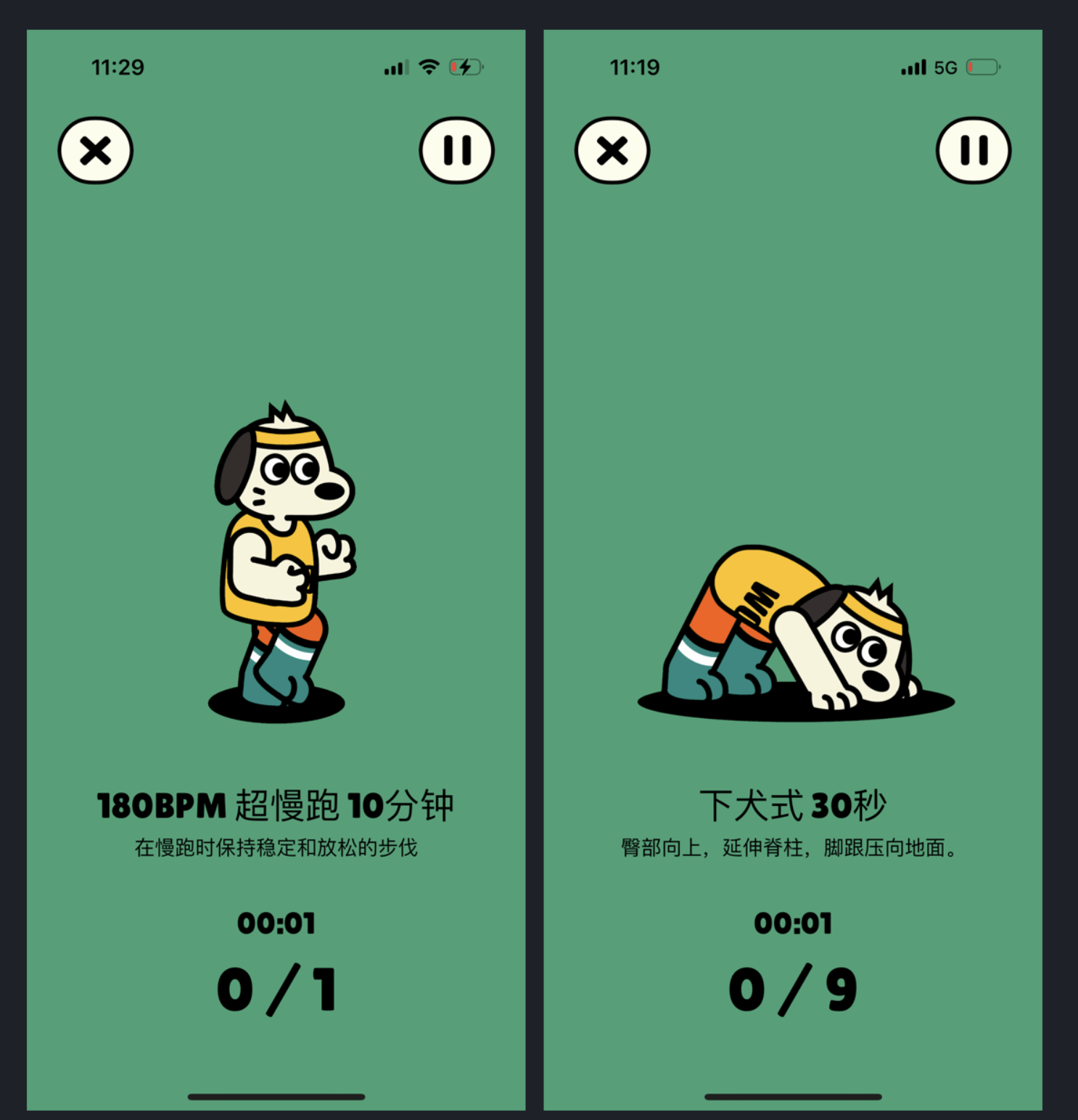打開 Rumbo,全程有個圓滾滾的卡通角色跟著你:做 “下犬式” 時,它會同步擺出同款姿勢,還會用萌萌的語氣提示 “腳跟再往下壓一點(diǎn)哦”;完成一組動作,它會搖著尾巴給你點(diǎn)贊。這個 IP 形象不是簡單的裝飾 —— 它把 “一個人運(yùn)動” 變成了 “和小伙伴一起打卡”,減少了用戶的孤獨(dú)感;甚至有用戶說 “為了看它夸我,都愿意多練 5 分鐘”。