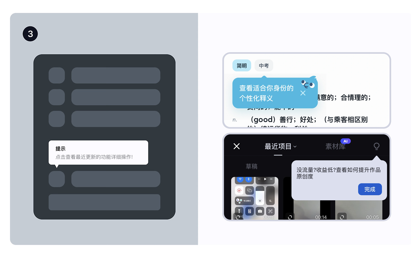 當用戶第一次點擊某個功能(比如新按鈕、新模塊)時,用小氣泡給出簡短說明,不打斷操作流程,很適合功能細節(jié)引導(dǎo)。