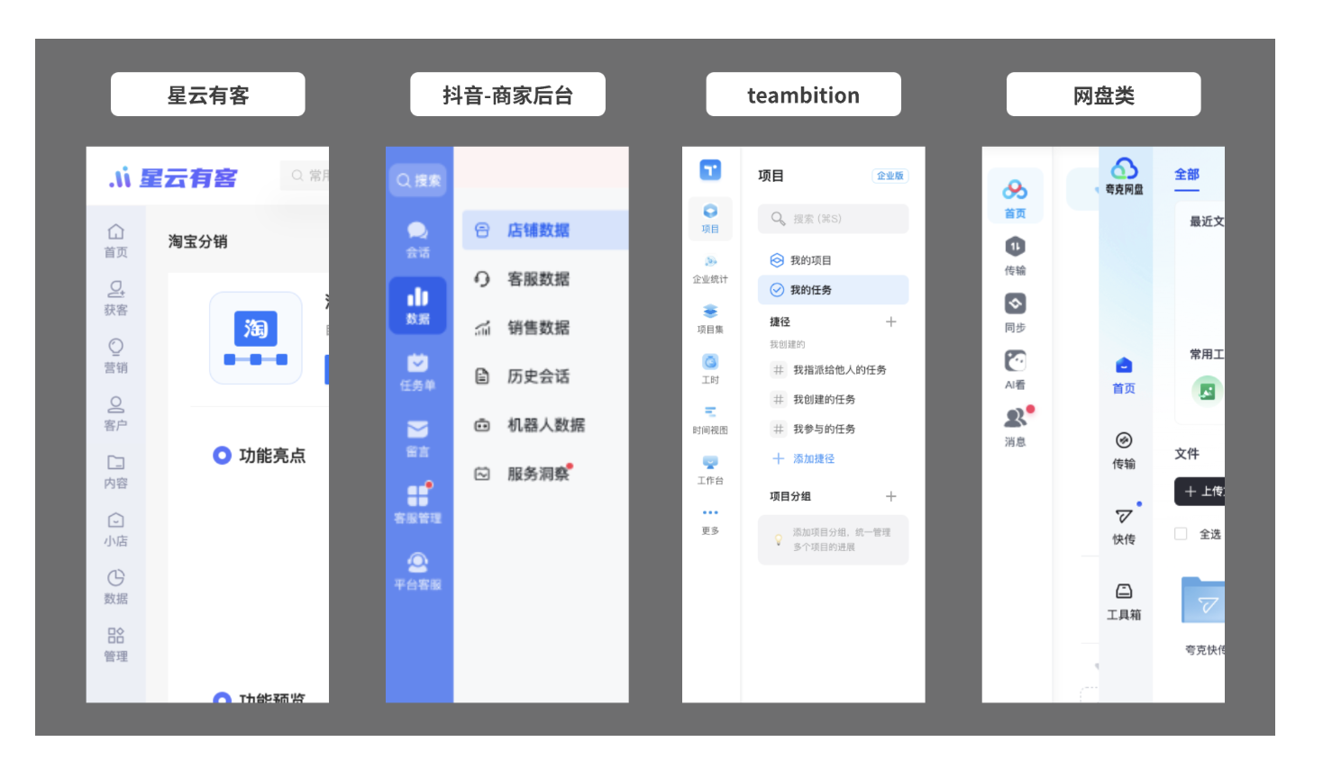 - 細(xì)欄(垂直導(dǎo)航):以圖標(biāo)為核心,文字輔助說明,適用于模塊較少、需最大化展示內(nèi)容區(qū)域的場景,如網(wǎng)盤類產(chǎn)品、輕量型工具后臺。優(yōu)勢是簡潔高效,能減少導(dǎo)航對核心工作區(qū)的占用,但要求用戶對圖標(biāo)含義有較高認(rèn)知度,典型案例包括夸克網(wǎng)盤、Teambition 企業(yè)版。