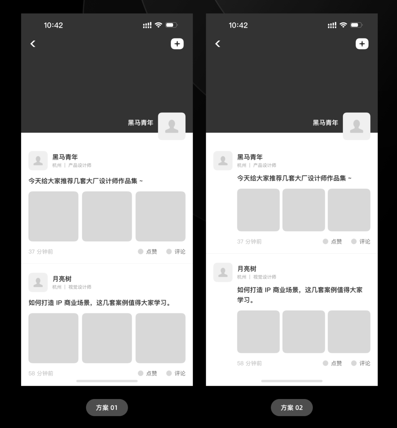 - 方案 02:左側(cè)展示發(fā)布者頭像與昵稱,右側(cè)展示動態(tài)內(nèi)容,強(qiáng)化用戶之間的關(guān)聯(lián)感