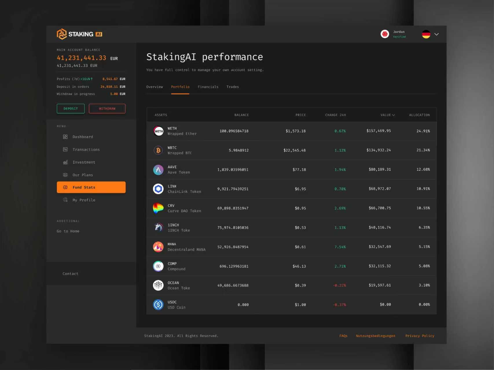 狀態(tài)無感化反饋:待處理訂單的 “14,681.61 EUR” 以淺灰小字弱提示,既傳遞信息又不干擾核心數(shù)據(jù);資產(chǎn)占比的 “24.91%” 等數(shù)據(jù)以低飽和灰色呈現(xiàn),讓投資者聚焦 “波動與價值” 的核心信息。