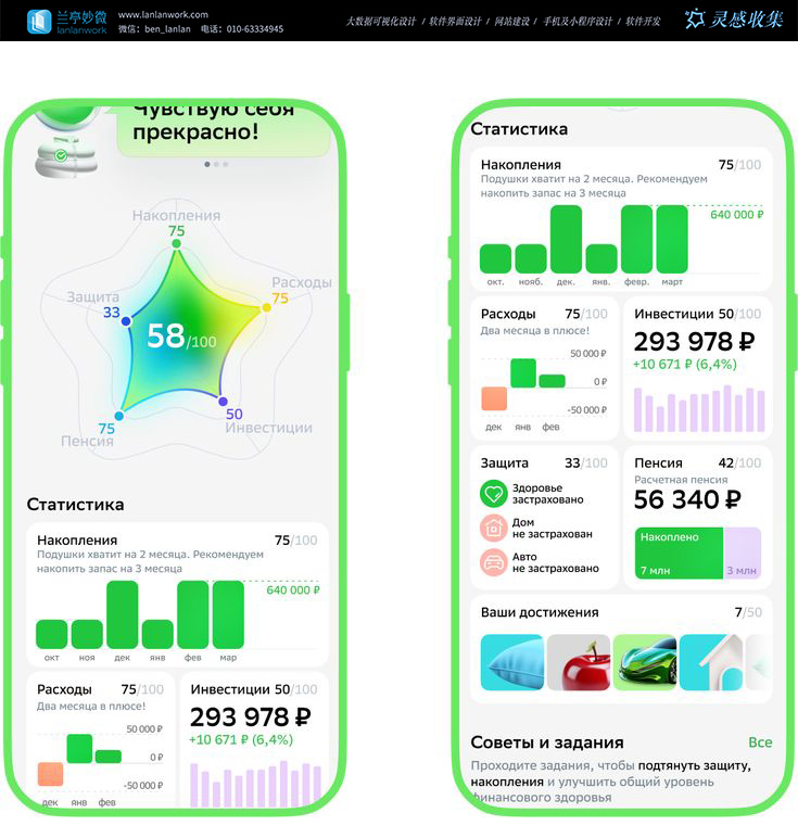 行動(dòng)引導(dǎo)層:底部的 “Советы и задания”(建議與任務(wù))模塊,將 “提升保險(xiǎn)、增加儲(chǔ)蓄” 等理財(cái)目標(biāo)轉(zhuǎn)化為 “可執(zhí)行的小任務(wù)”,搭配 “你的成就” 可視化激勵(lì),讓用戶從 “被動(dòng)看數(shù)據(jù)” 轉(zhuǎn)向 “主動(dòng)做改善”,契合俄語(yǔ)區(qū)用戶偏好 “明確指令 + 即時(shí)反饋” 的交互習(xí)慣。