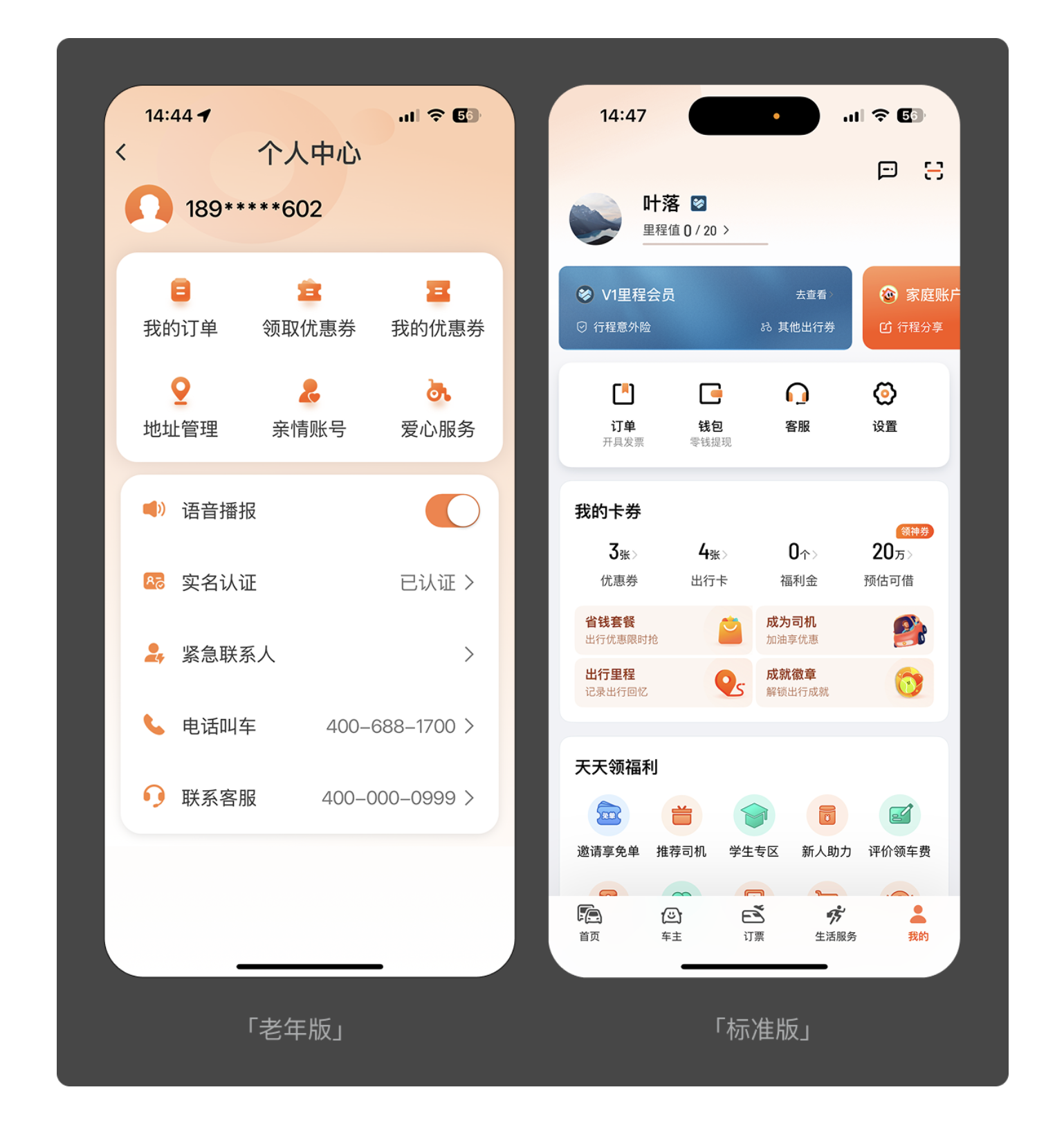 老年用戶對復(fù)雜界面的接受度較低,簡潔明了的布局能有效減少挫敗感。淘寶老年版摒棄了標(biāo)準(zhǔn)版密密麻麻的功能模塊和促銷信息,僅保留 “我的訂單”“購物車”“常用店鋪” 等核心功能,并用超大字體和醒目圖標(biāo)展示,讓老年人一眼就能找到所需功能。滴滴老年版的界面也做了類似優(yōu)化,去除了特價拼車、快送跑腿等次要服務(wù),僅保留出租車、網(wǎng)約車等核心出行功能,避免用戶因選擇過多而困惑。