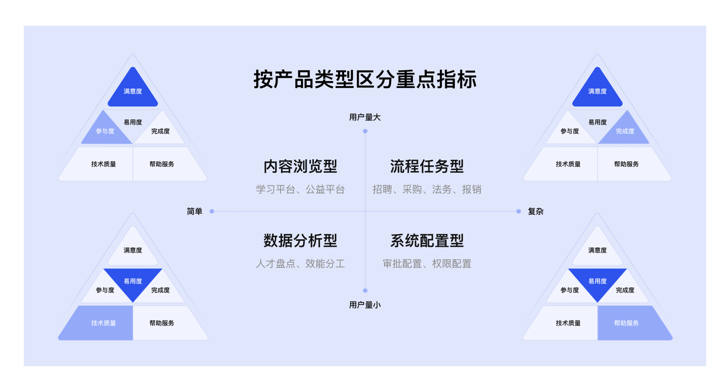 根據(jù) “用戶量大小” 與 “操作復(fù)雜度”,將產(chǎn)品分為四類,聚焦不同指標: