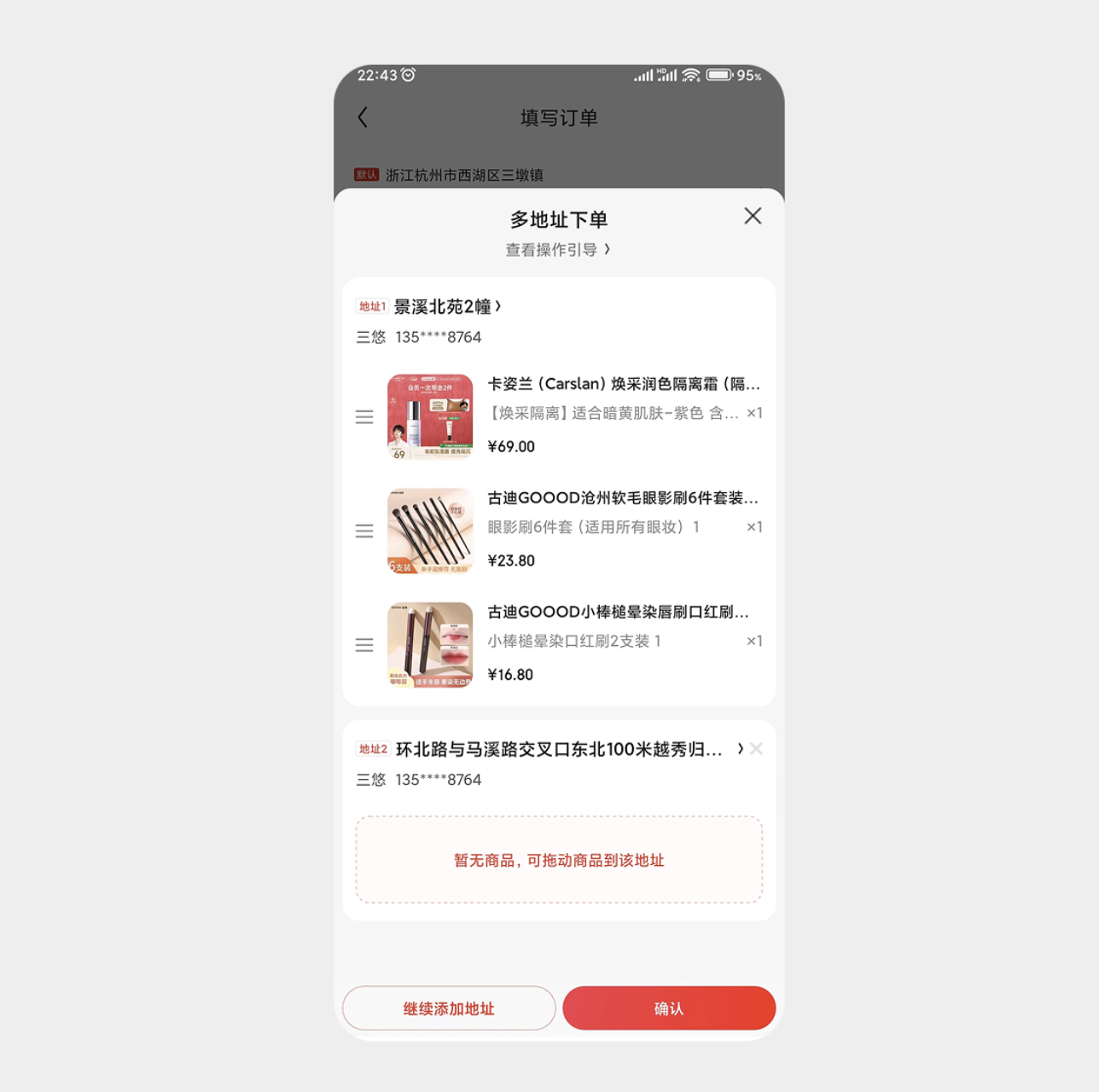 拖拽手勢是高效分配類場景的優選方案。例如電商平臺的多地址下單功能,用戶可直接拖拽商品至不同收貨地址欄,實現一鍵分配,避免重復勾選或填寫的繁瑣操作。這種設計將抽象的 "商品分配" 需求轉化為具象的拖拽動作,操作路徑清晰,同時配合地址欄的空狀態提示,讓用戶實時掌握分配進度,大幅提升下單效率。