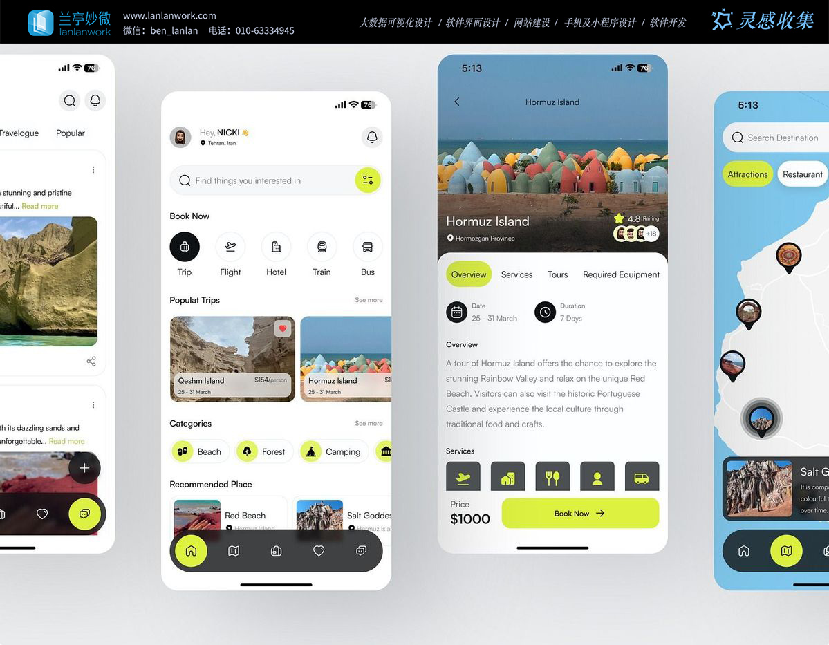 好的旅行 APP,從來不是冰冷的功能集合,而是 “旅行體驗的延伸”。這款 APP 的設計細節里,藏著對 “旅行情緒” 的精準捕捉:比如 Hormuz Island 詳情頁的介紹文案,沒有堆砌 “必去”“絕美” 等形容詞,而是用 “explore the stunning Rainbow Valley”“relax on the unique Red Beach” 這樣的動詞短語,把 “向往感” 具象成可感知的畫面;底部的導航欄用柔和的圖標替代了生硬的文字,“首頁”“行程”“收藏” 的功能區分,像把旅行的節奏 “握” 在了指尖。